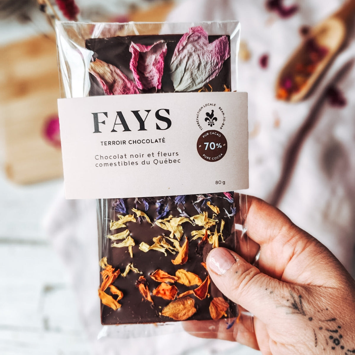 Tablette de chocolat* noir 70 % torréfié au Québec, généreusement garnie d’un bouquet de pétales de fleurs** comestibles. Une expérience 100 % d’ici!