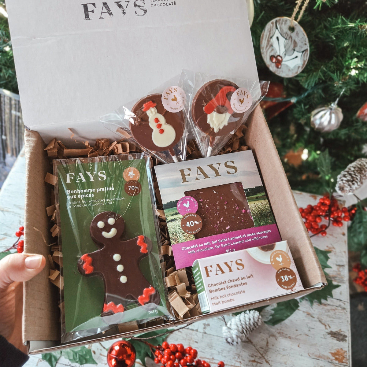 On y retrouve un bonhomme praliné aux épices, une tablette aux saveurs boréales (Sel Saint-Laurent et roses sauvages), deux bombes à chocolat chaud et deux suçons festifs au chocolat au lait.