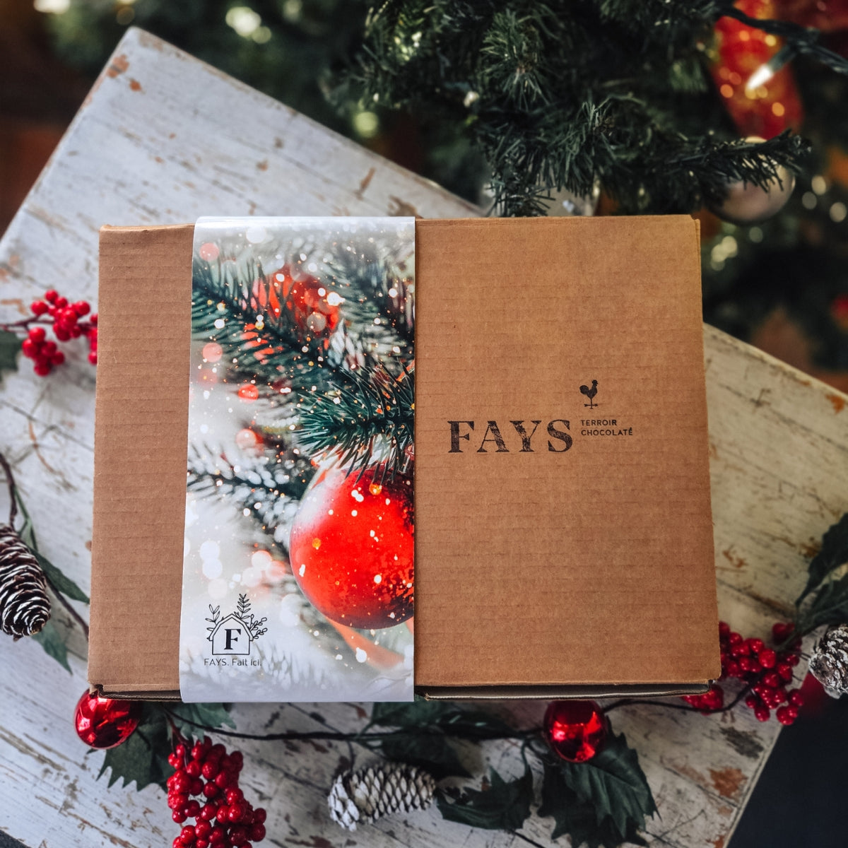 - Emballage en boîte rigide avec bandeau décoratif hivernal et festif