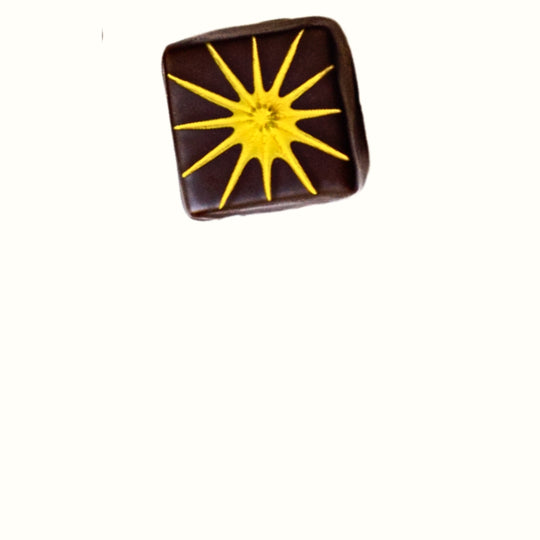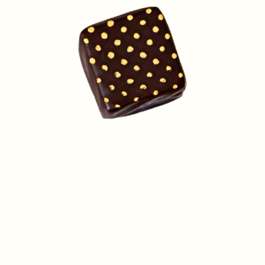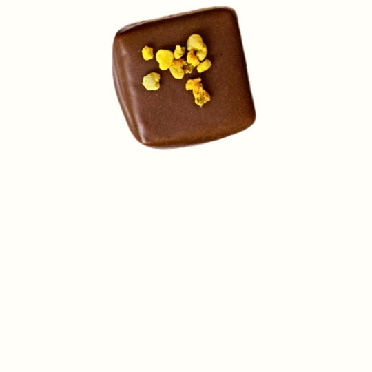 Ganache de chocolat noir au miel de fleurs sauvages*, enrobée de chocolat au lait.