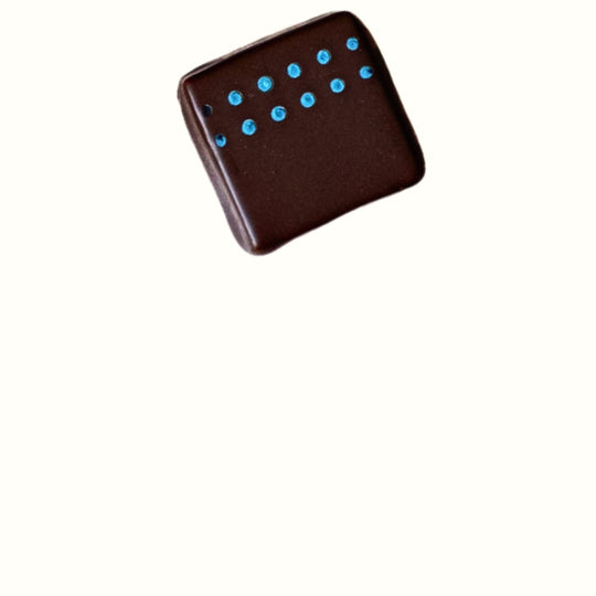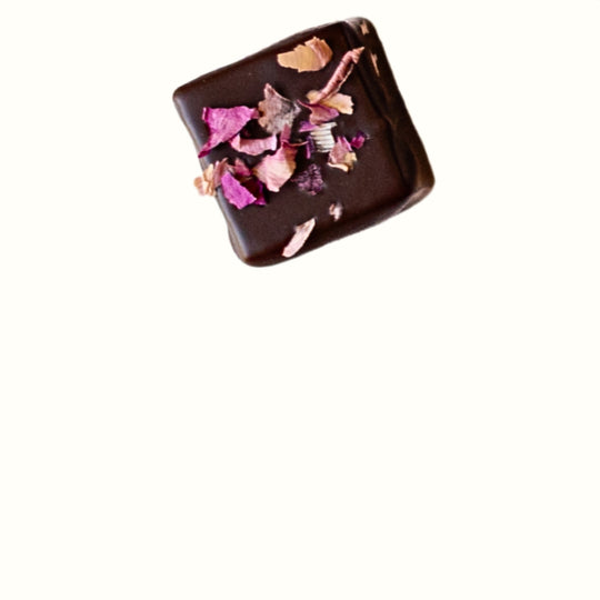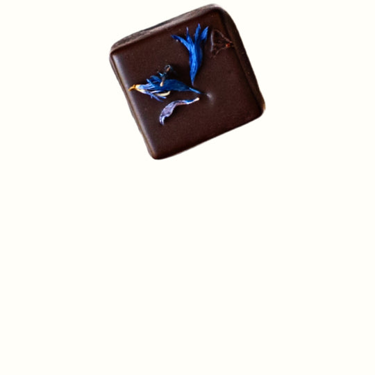 Ganache de chocolat noir au poivre clavalier*, décorée de pétales de centaurée séchés*.