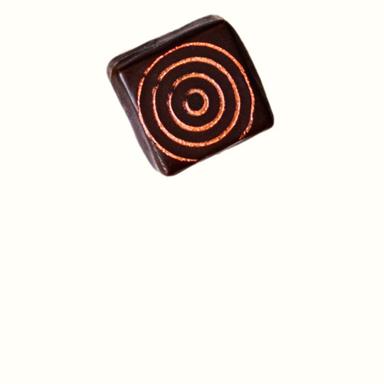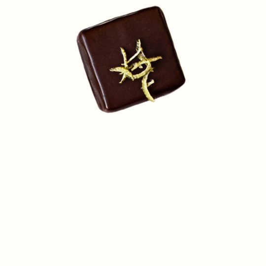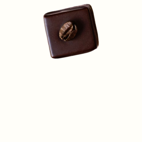 Ganache de chocolat noir au café* sur un praliné d'amandes aux épices.