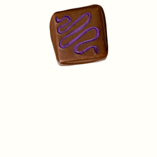 Ganache de chocolat au lait à la camerise*, thé du Labrador* et lavande*, enrobée de chocolat au lait.