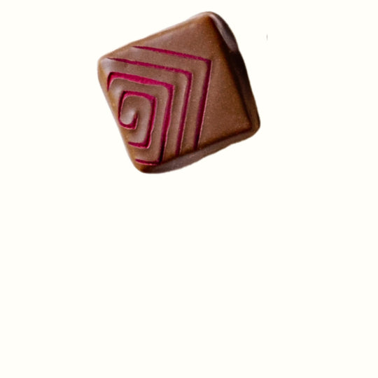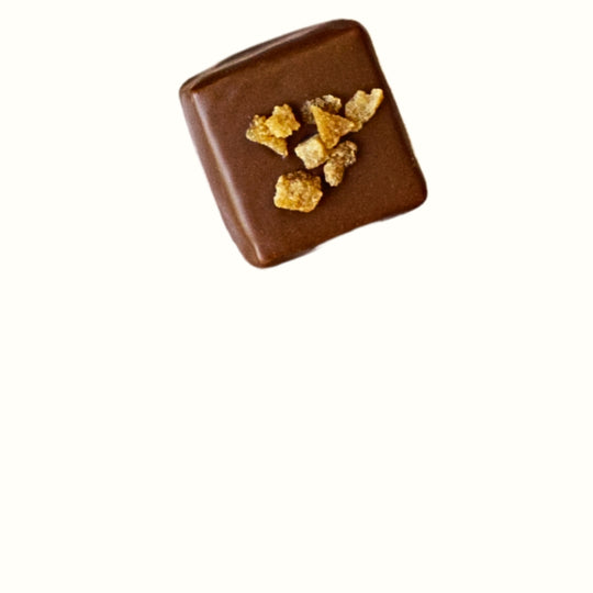 Ganache de chocolat au lait au sirop d'érable* sur un praliné de noix de cajou, enrobée de chocolat au lait.